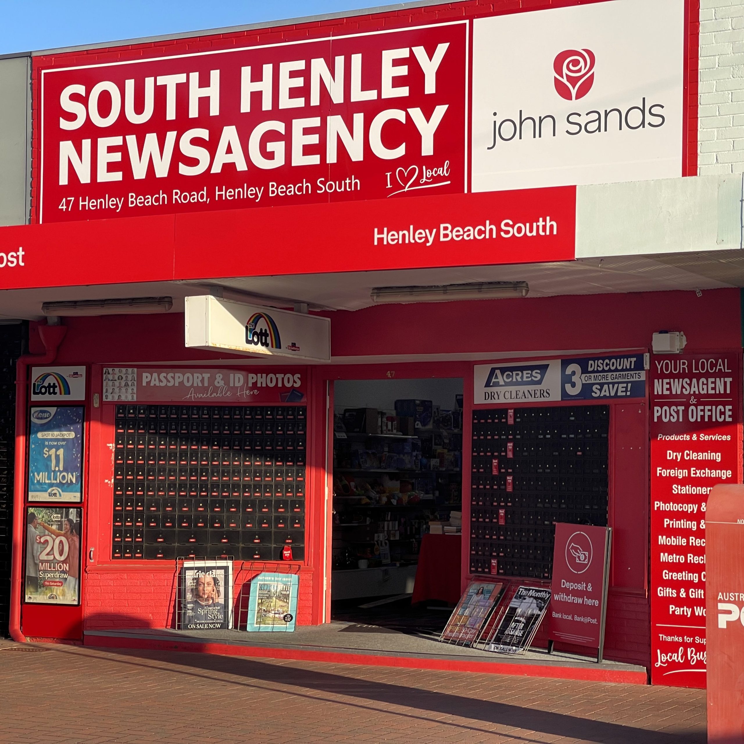 All Australia Post services, Passport Photos, PO Boxes, Lotto, Stationery, Books, Magazines, Gifts, Dry Cleaning, Western Union, Photocopying, Scanning & Faxing